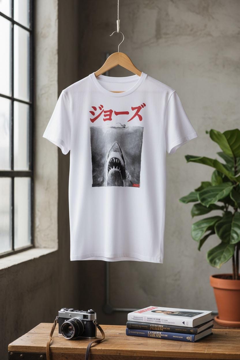Make a splash with this bold Jaws Japanese Style Poster T-Shirt! 🦈 Featuring an eye-catching Japanese-inspired design of the classic Jaws movie poster, this tee is perfect for movie lovers and vintage art fans alike.