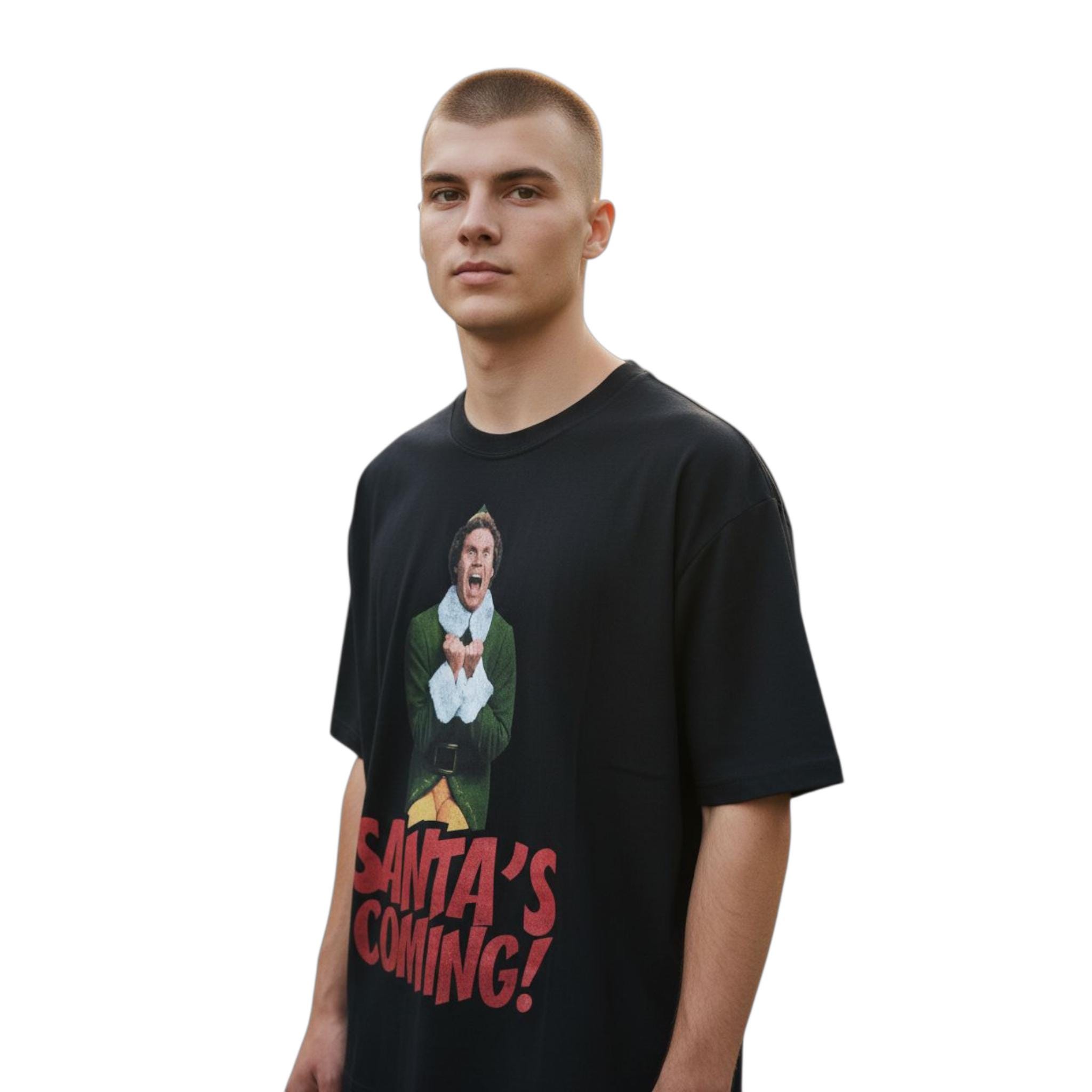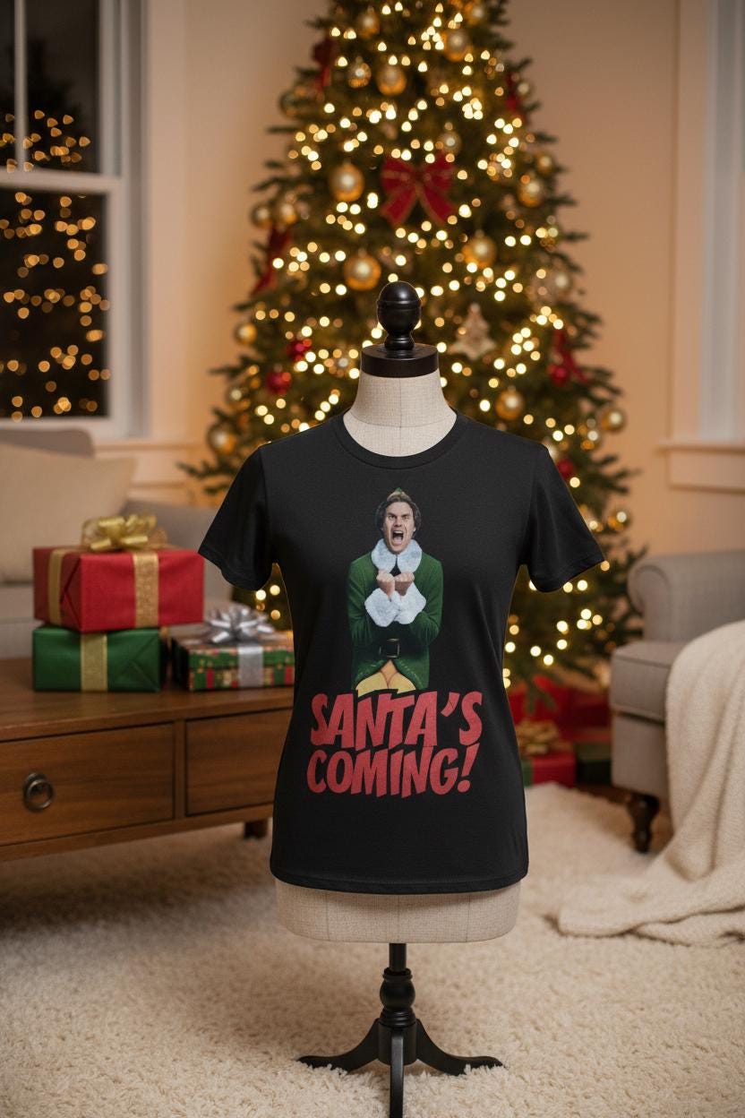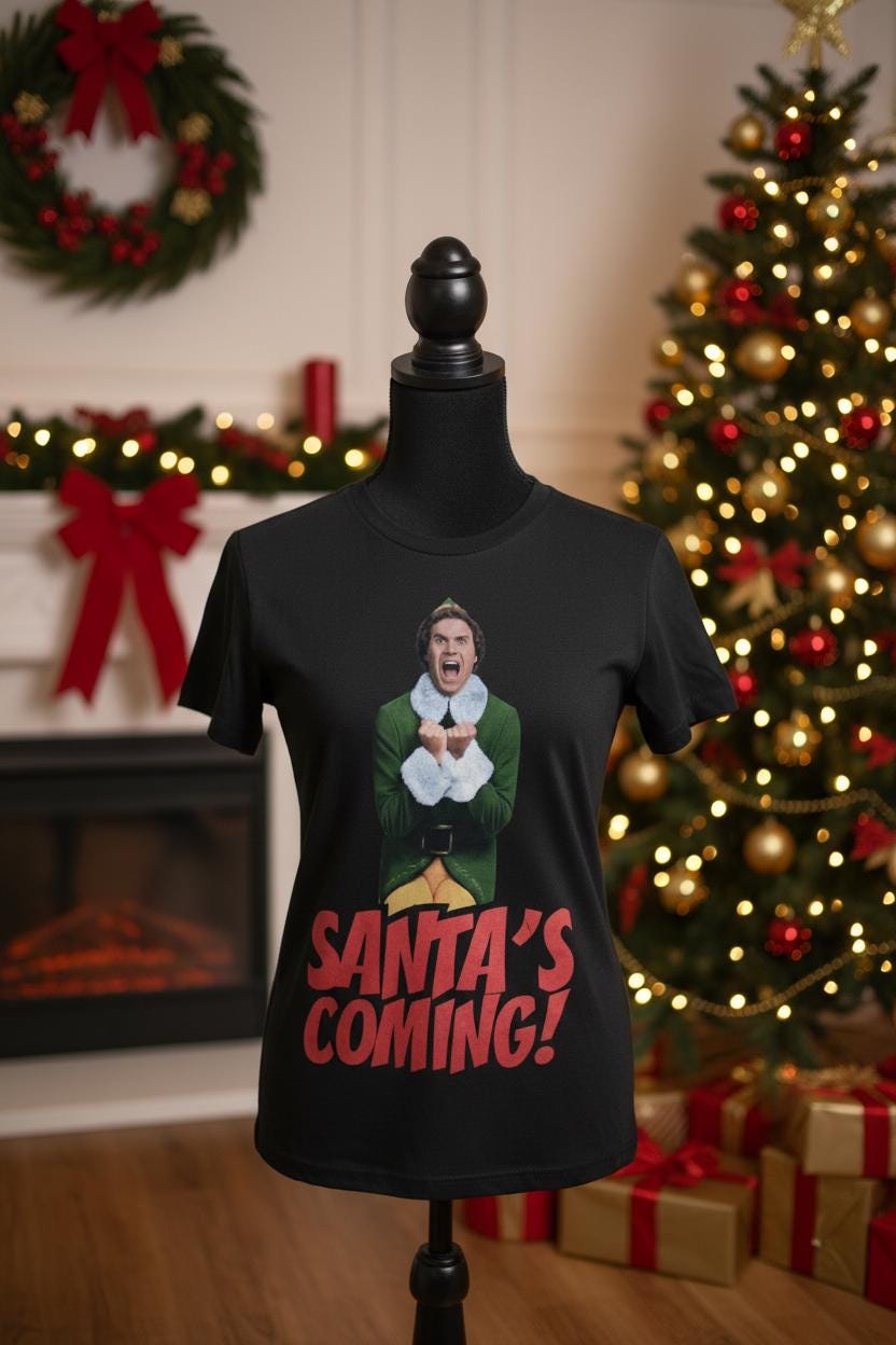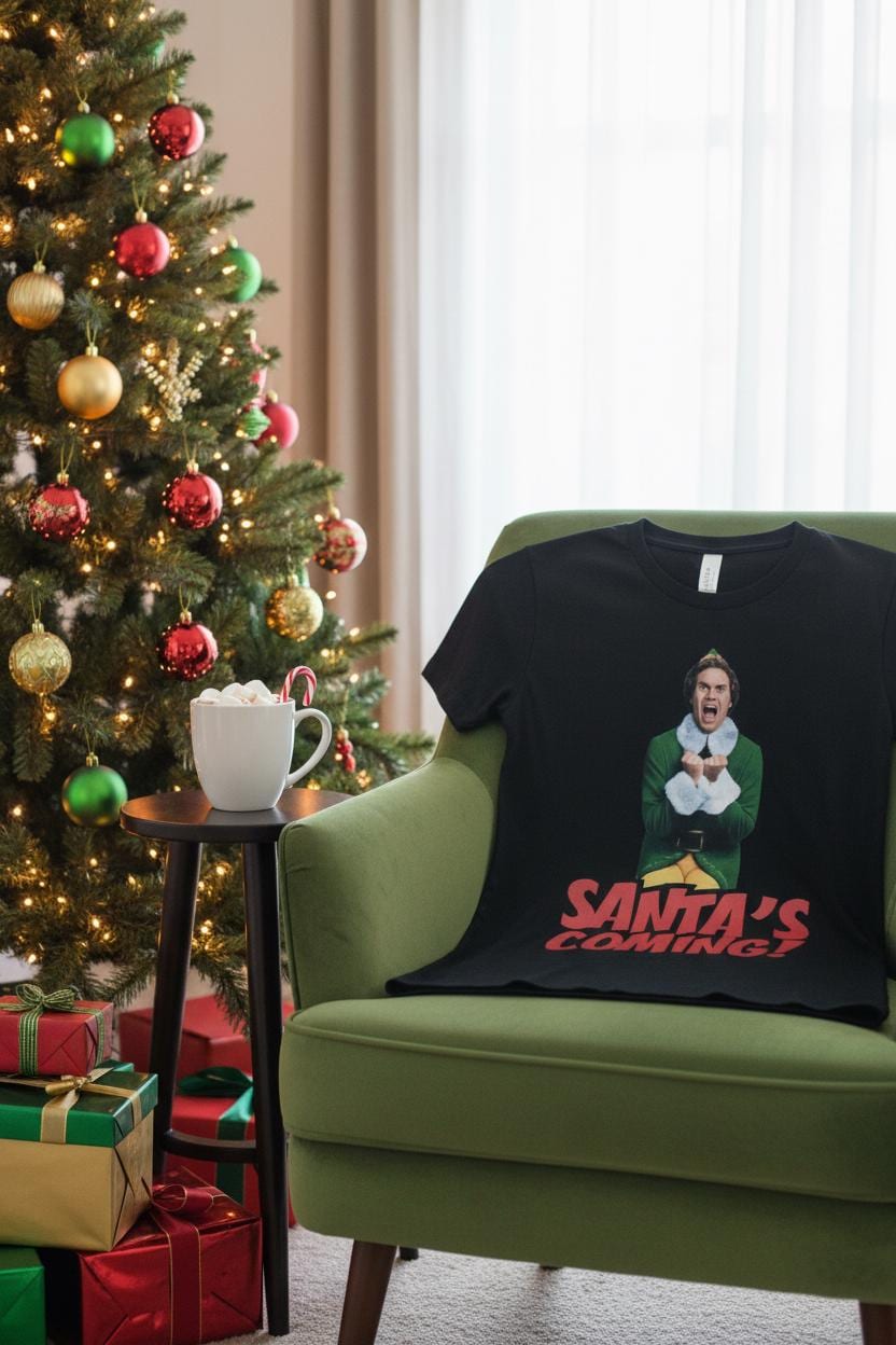 Design: Bold “Santa’s Coming!” print inspired by the iconic holiday movie Elf