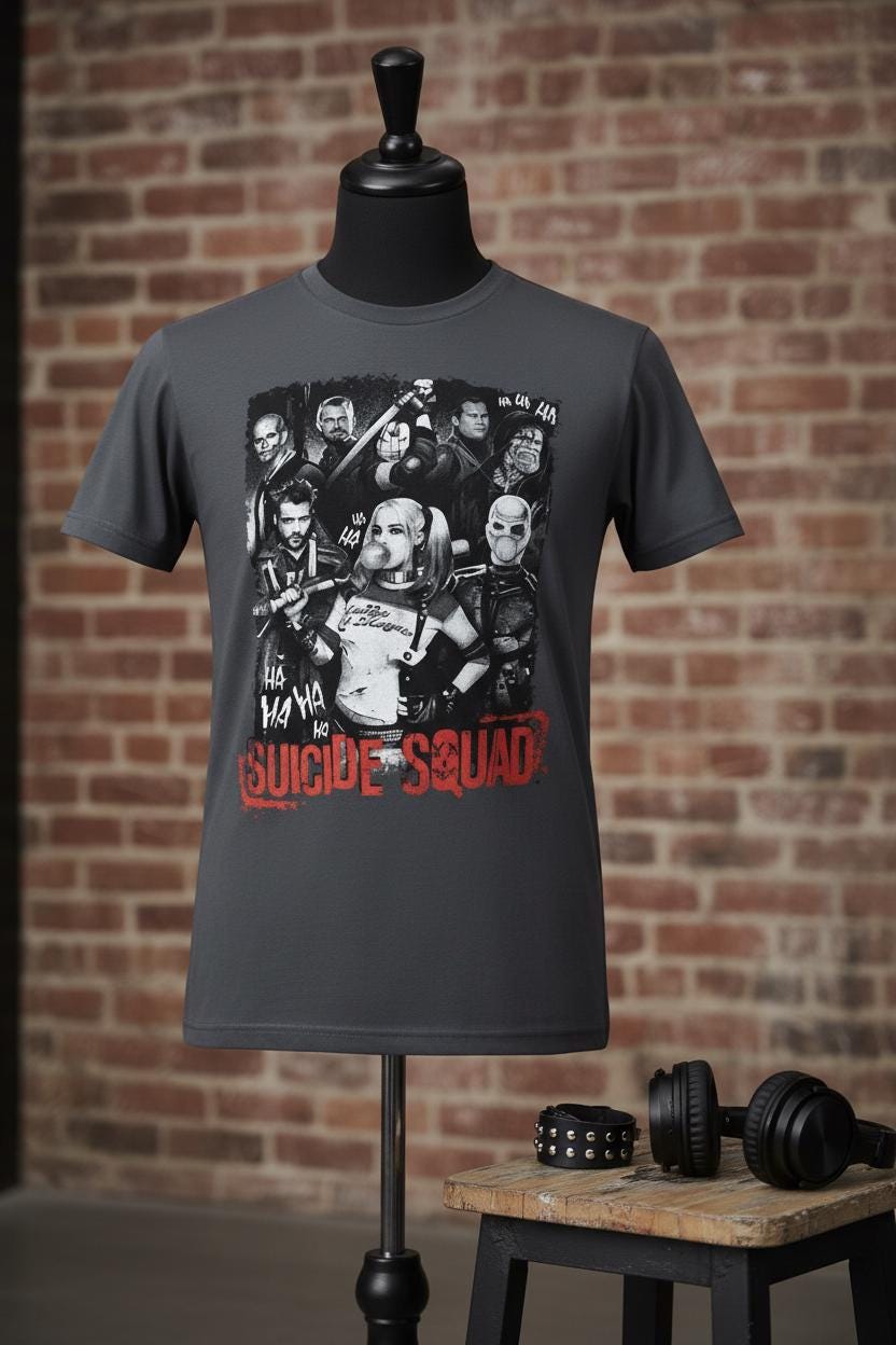 Show off your love for the chaotic world of Suicide Squad with this bold and stylish unisex grey graphic tee. Perfect for fans of Harley Quinn, Deadshot, Joker, and the unforgettable DC Comics anti-hero team.