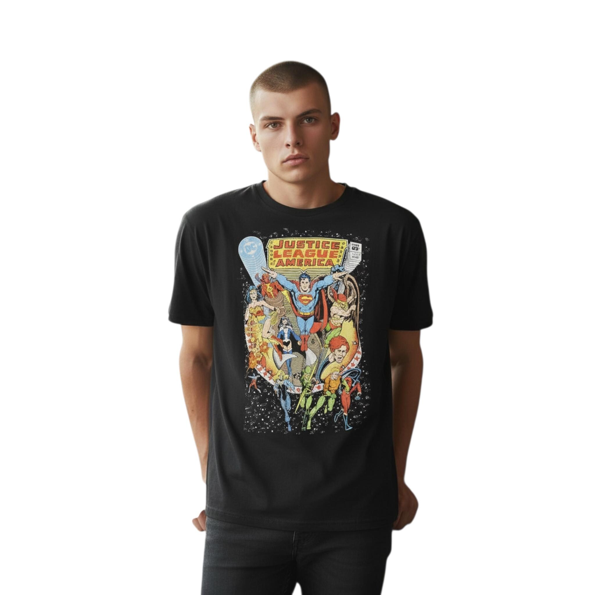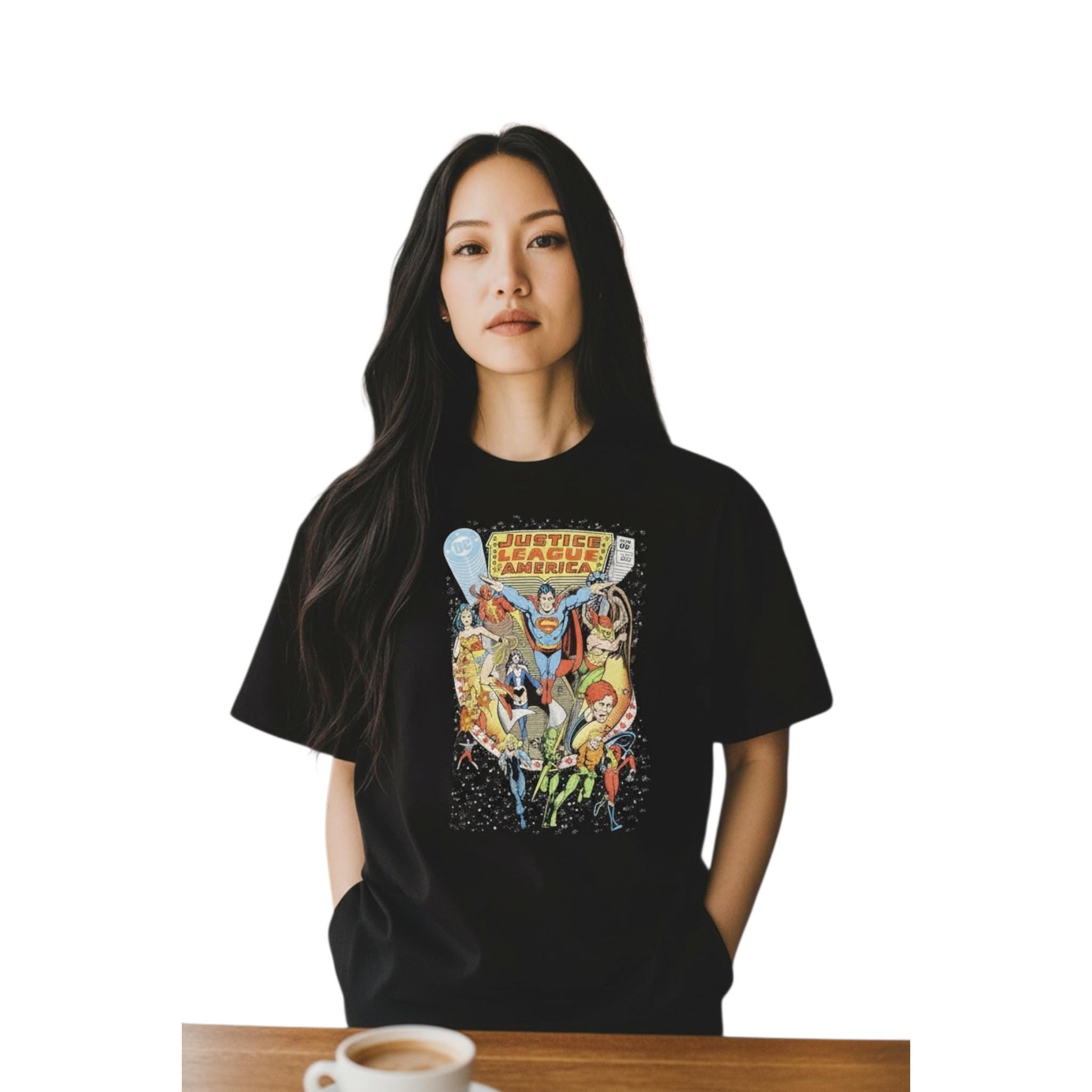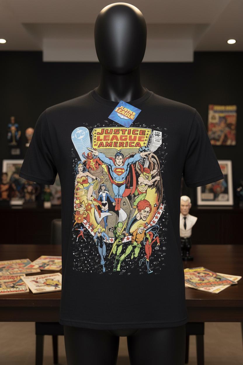 Power up your wardrobe with this Justice League America T-Shirt, featuring the legendary DC Comics superhero team. Inspired by the iconic JLA (Justice League of America) comics, this graphic tee is perfect for fans of classic superheroes and comic book culture.