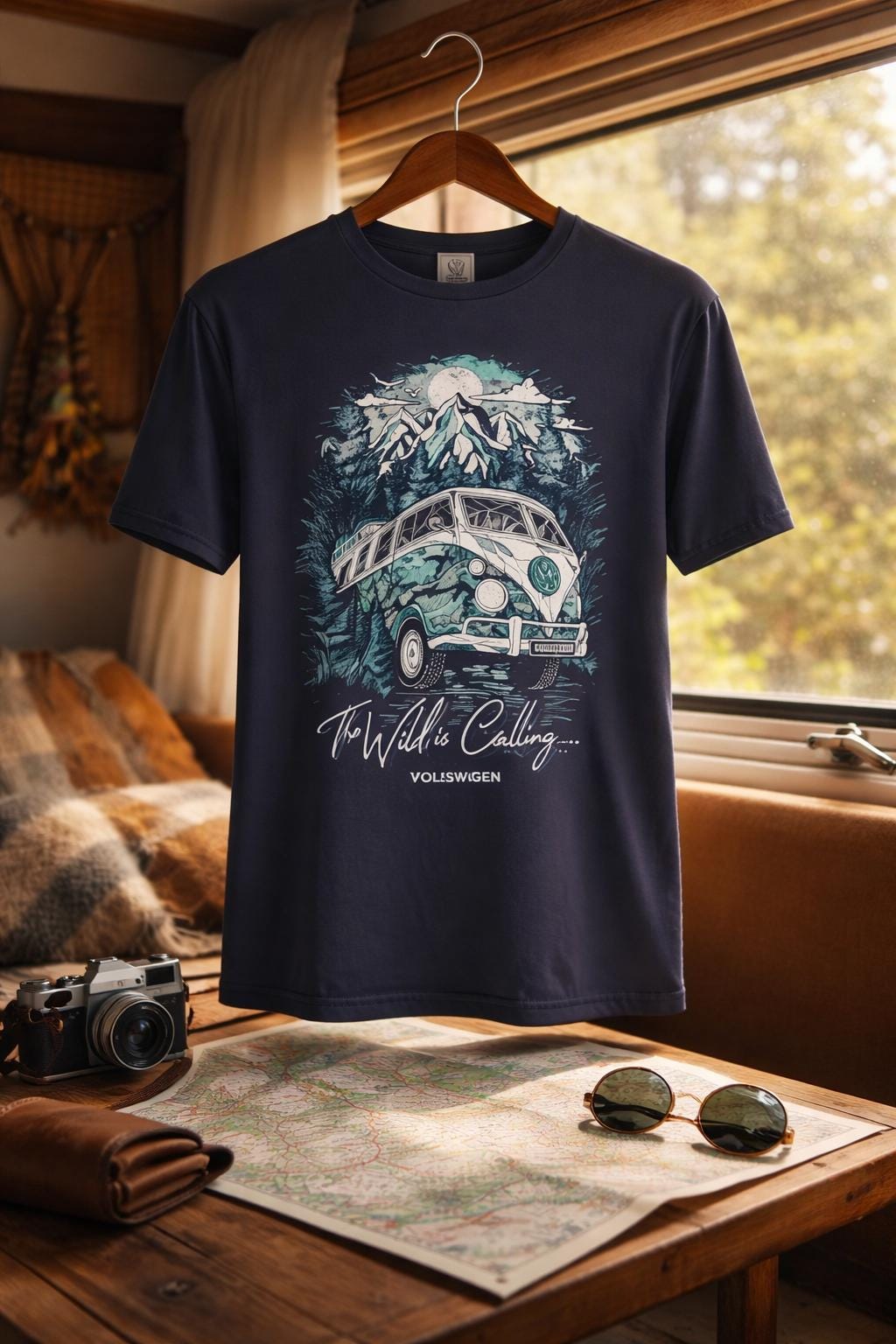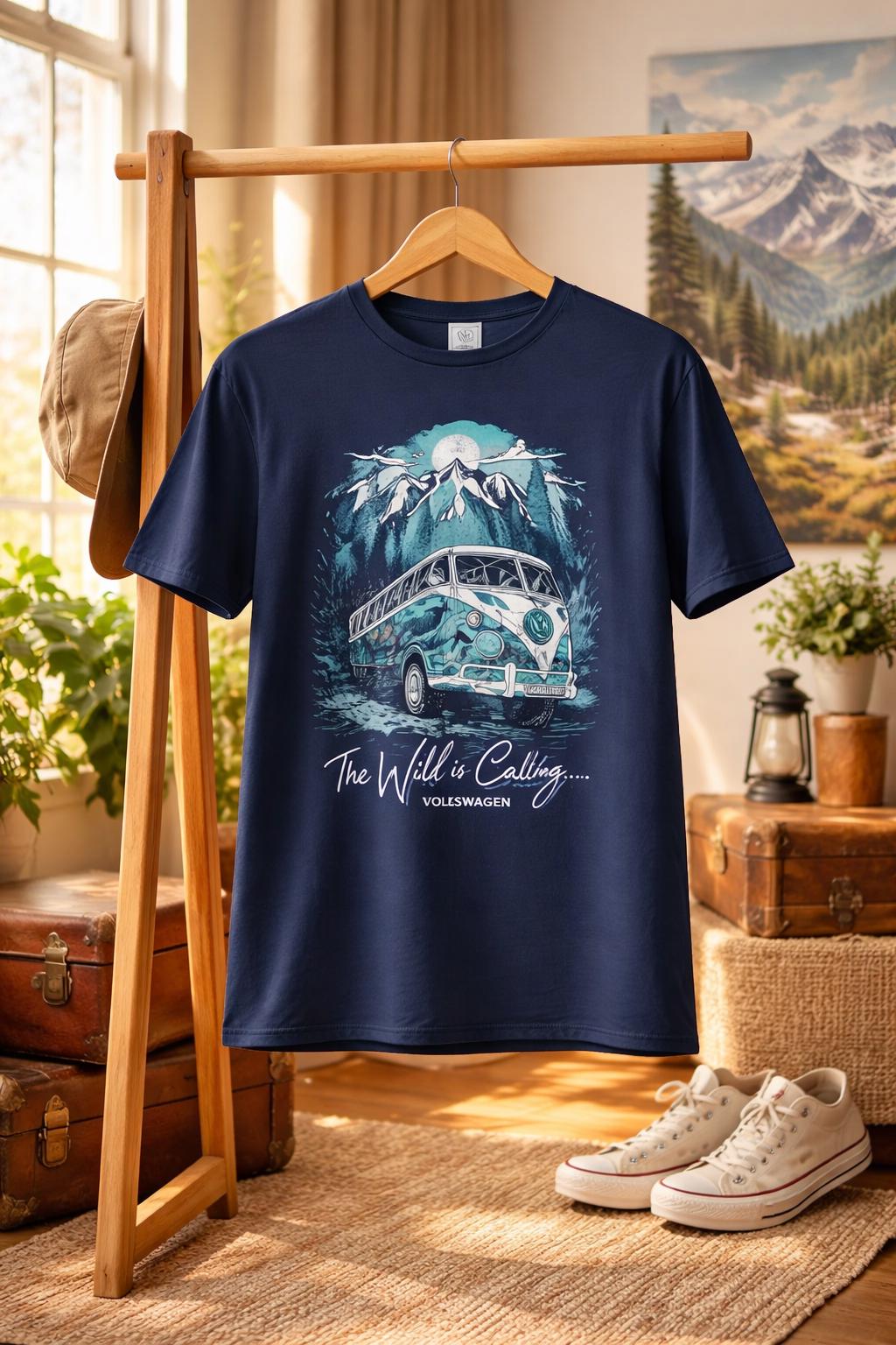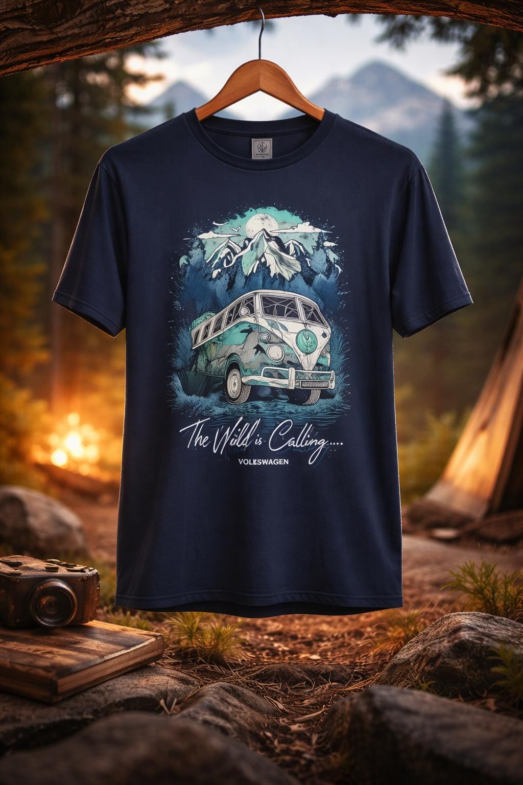 Answer the call of adventure with this Volkswagen “The Wild Is Calling” unisex navy t-shirt. Featuring a classic VW camper van graphic and outdoor-inspired design, this tee is perfect for road trip lovers, campers, and vintage Volkswagen fans.
