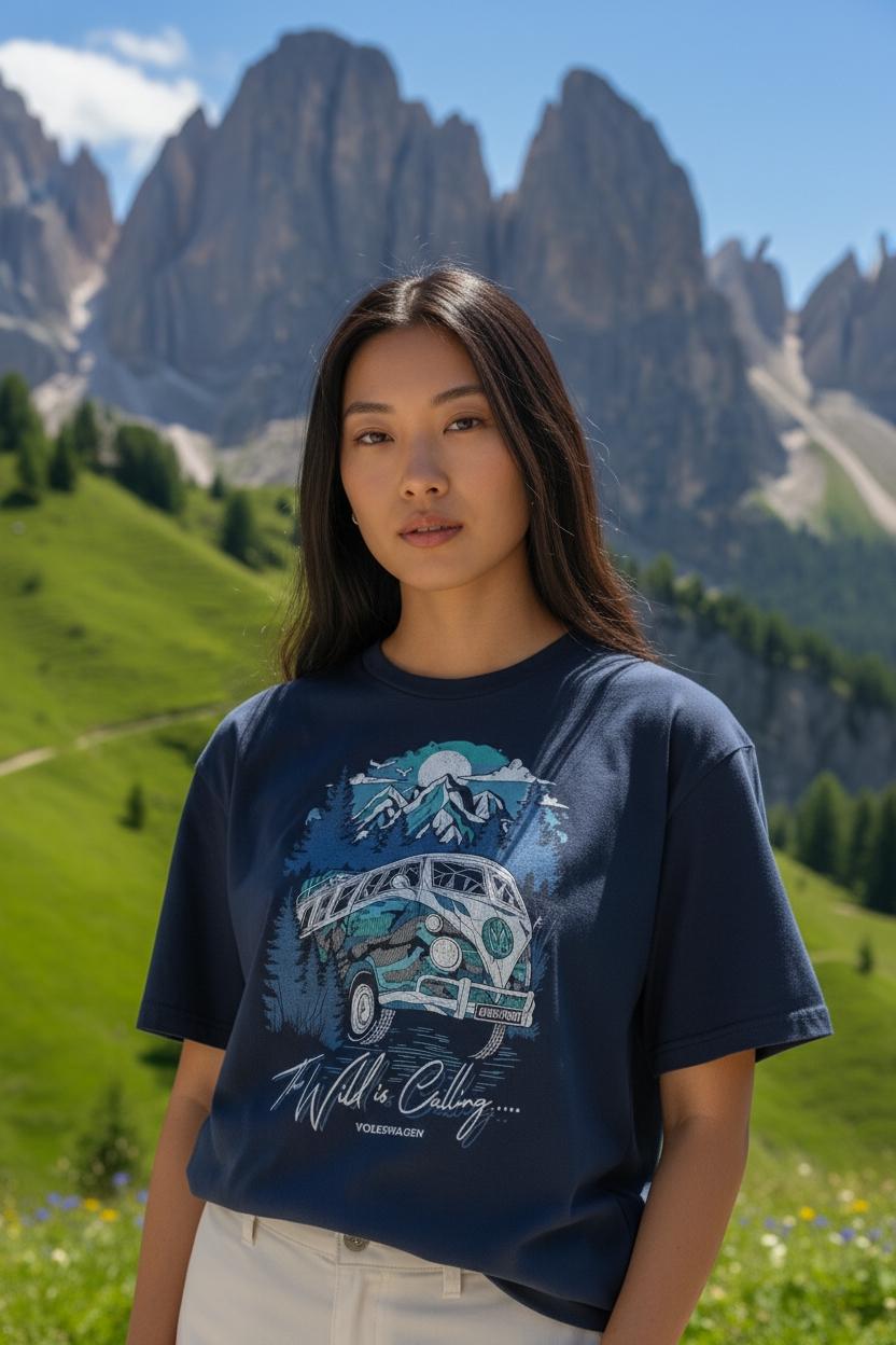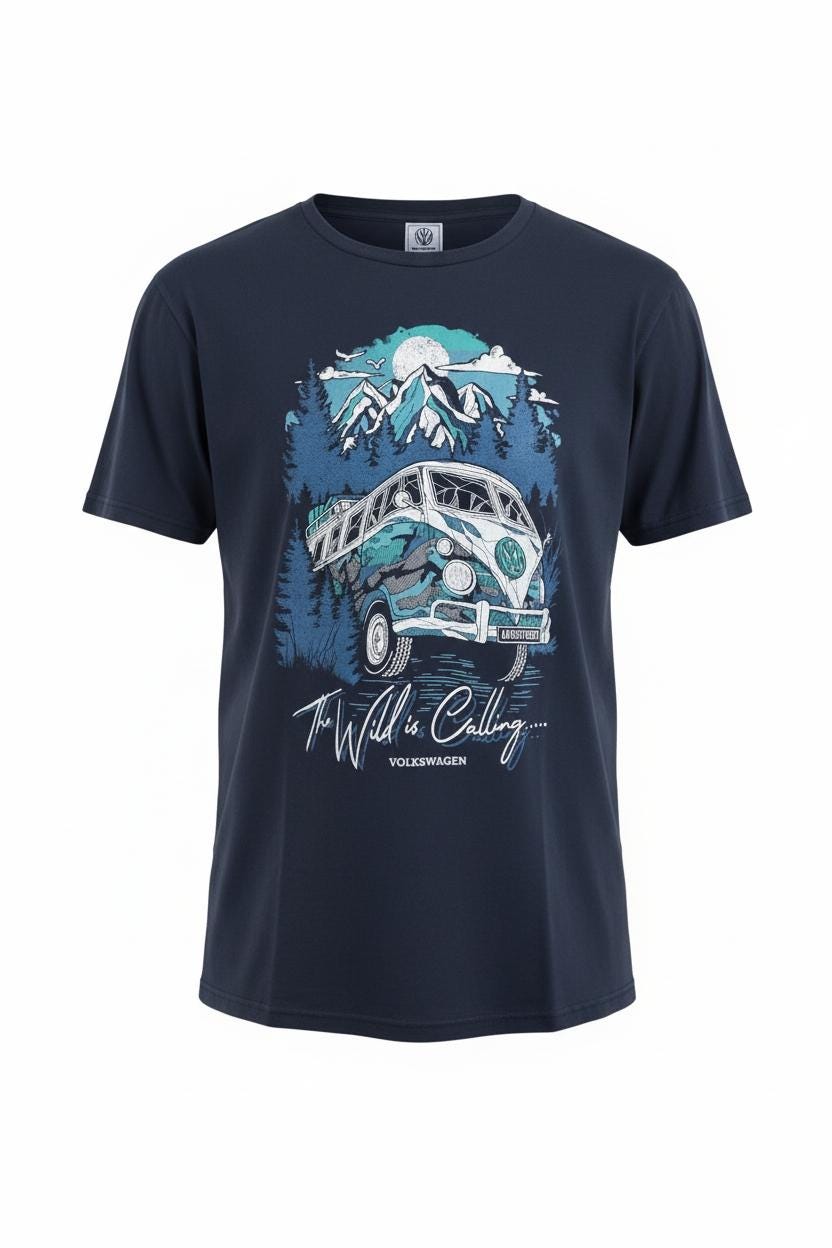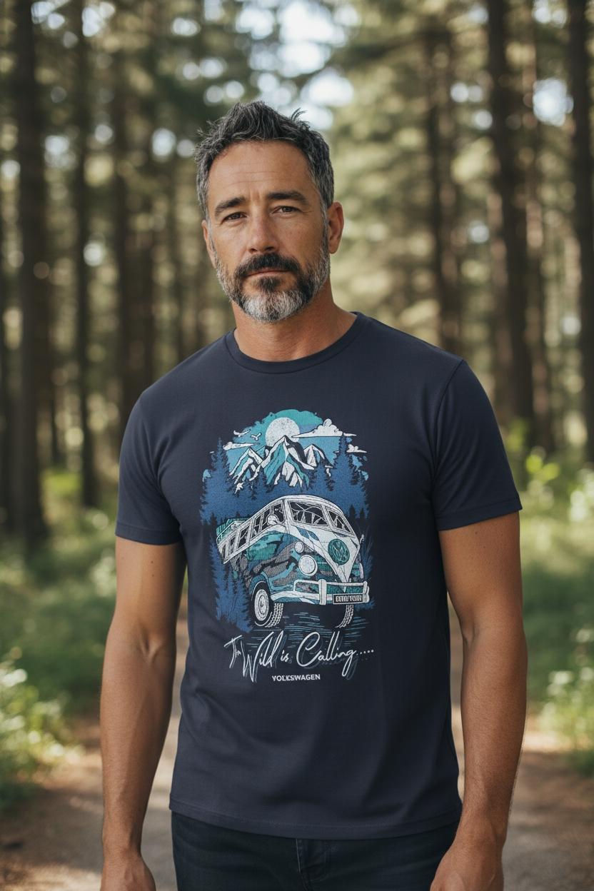Answer the call of adventure with this Volkswagen “The Wild Is Calling” unisex navy t-shirt. Featuring a classic VW camper van graphic and outdoor-inspired design, this tee is perfect for road trip lovers, campers, and vintage Volkswagen fans.